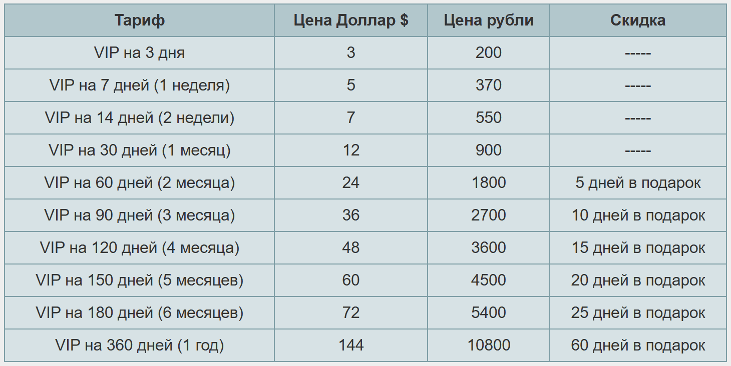 Внимание! С 05.02.2024 действуют новые тарифы на VIP услуги, а также на покупку админок. Последнее изменение цен на VIP услуги было 10.01.2022